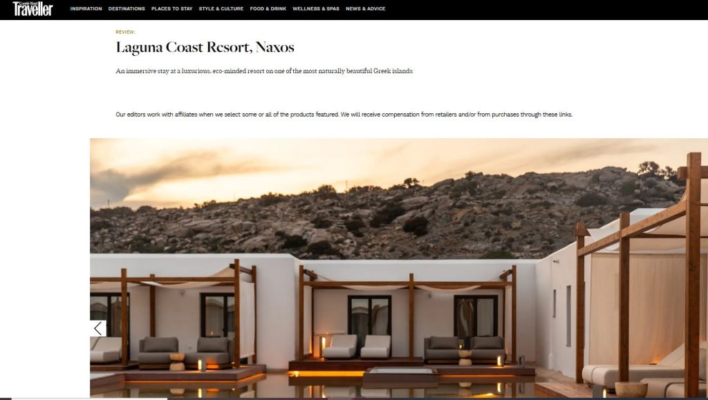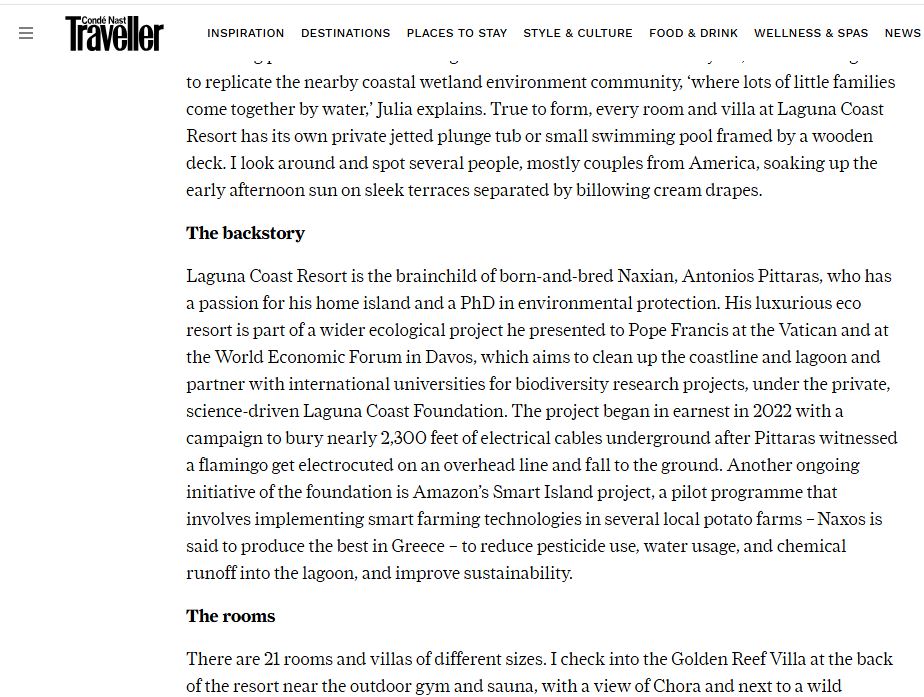 Η σημαντική διεθνής διάκριση μόνο τυχαία δεν είναι και ήρθε μια μέρα μετά την αναγνώριση του Laguna Coast Resort ως «η βιώσιμη πολυτέλεια που ξανασυστήνει το νησί στον παγκόσμιο χάρτη». Συγκεκριμένα το βρετανικό περιοδικίο Conde Nast Traveller μέσα απο ένα εκτενές άρθρο του, χαρακτηρίζει το διαμονή στο Laguna Coast Resort «καθηλωτική σε ένα πολυτελές, οικολογικό θέρετρο». Όπως αναφέρει το περιοδικό, «Ένα φιλόδοξο έργο αναγέννησης 480 στρεμμάτων – το μεγαλύτερο στις Κυκλάδες – στοχεύει στην προστασία του γύρω τοπίου. Είναι επίσης μια δικαιολογία για να επισκεφθείτε την ηλιόλουστη, εύφορη Νάξο, έναν γήινο παράδεισο ελληνικού νησιού, γνωστή για την επική γαστρονομική της σκηνή, τα αρχαία ερείπια και τα λαμπερά παραδοσιακά ασβεστωμένα χωριά στις κορυφές των λόφων».